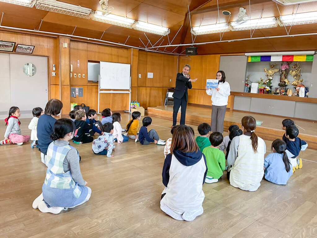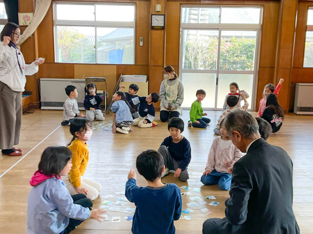 かるたの後には、大生産業さんがどんなお仕事をしているのかを、子どもたちにも分かりやすくお話ししてくれました。 「みんなが住んでいるお家や、お父さん・お母さんが車を停める駐車場を守るお手伝いをしているんだよ」という言葉に、子どもたちも興味津々。 地域を支える大人とかかわる、とても素敵な時間になりました。