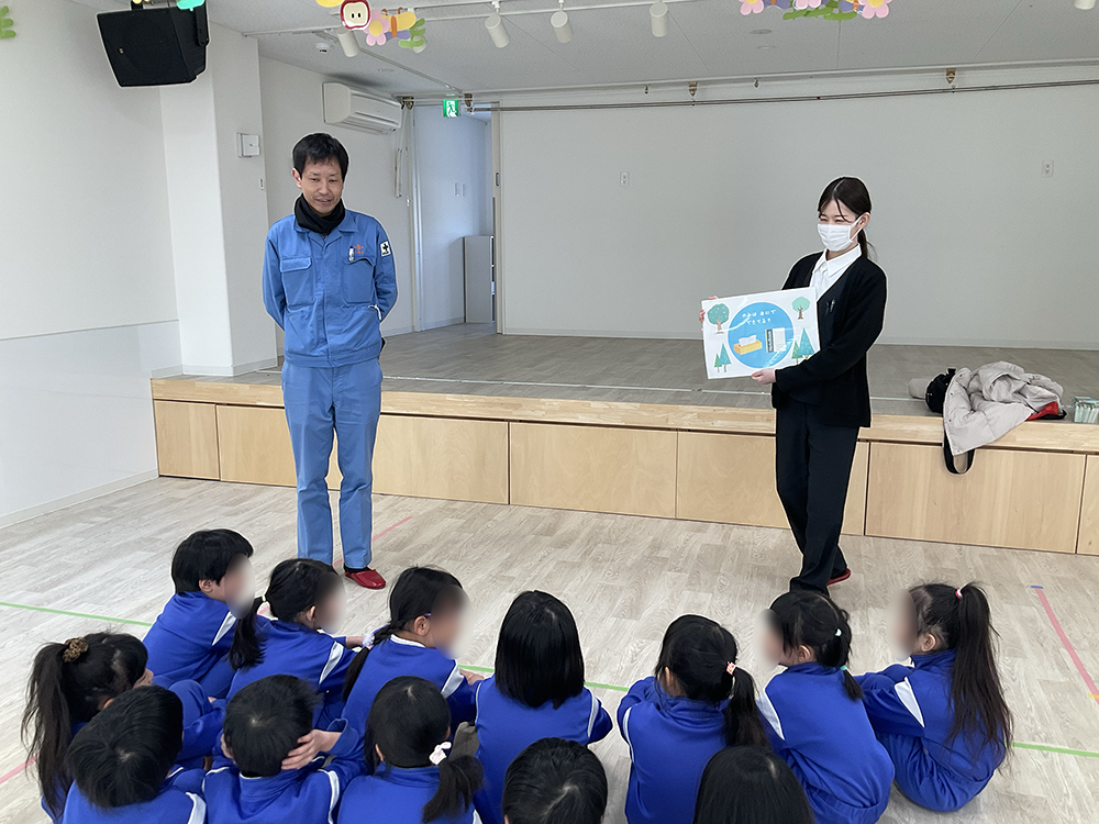 古い紙を水に溶かしてドロドロにし、ゴミを取り除いてから、もう一度紙に戻す。その「乾かす工程」で水蒸気が出るんだよ――。 そんなリサイクルのお話を、紙芝居を通して伝えました。さっきまで賑やかだった子どもたちも、この時ばかりは真剣な表情で見入っていたのが印象的です🎵